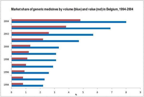 The market share of generic medicines by volume nearly quadrupled from 2.2% in 1994 to 8.0% in 2004 [1].