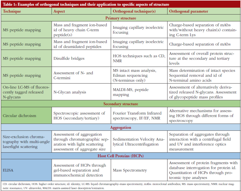 Dr Easton noted that orthogonality is crucially important for the structural and physicochemical types of analyses carried out by BioPharmaSpec. He highlighted that such tests are needed to produce a self-supporting dataset so that all aspects of the data can be relied upon. There are various orthogonal techniques employed at BioPharmaSpec, see Table 1. He noted, ‘to design an orthogonal experiment, it is key to understand what each technique can and can’t do so that you can deduce solid conclusions, a concrete package and in-depth knowledge of the molecule’.